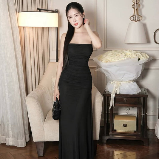Cross-border 2025 style 2025 spring new women's clothing elegant temperament simple pleated design perspective mesh dress
