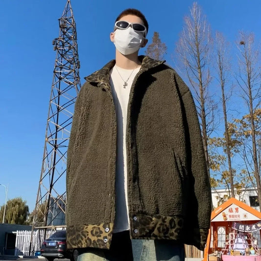 Leopard Padded Double-sided Thicken Jacket Men Vintage Winter Lambswool Warm Coat American Loose Warm Parkas Hip Hop Outwear