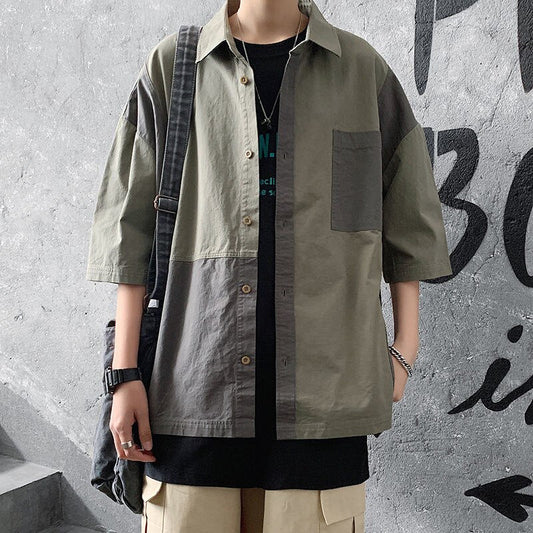 Men's Casual Patchwork Shirts Short Sleeve Loose Blouses Summer Fashion Tops Harajuku Male Japanese Cardigan