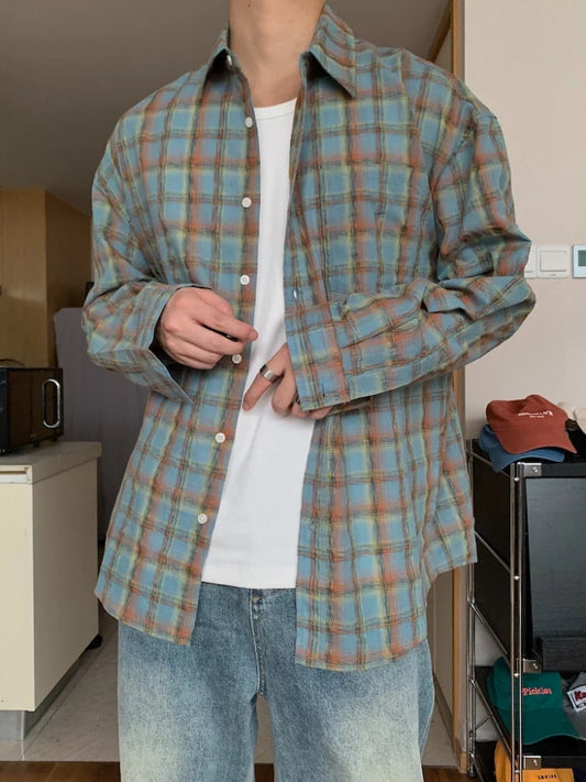Casual Shirts Men Loose Long Sleeve Handsome Spring Autumn Daily Plaid Streetwear Fashion Korean Style Unisex Turn-down Collar