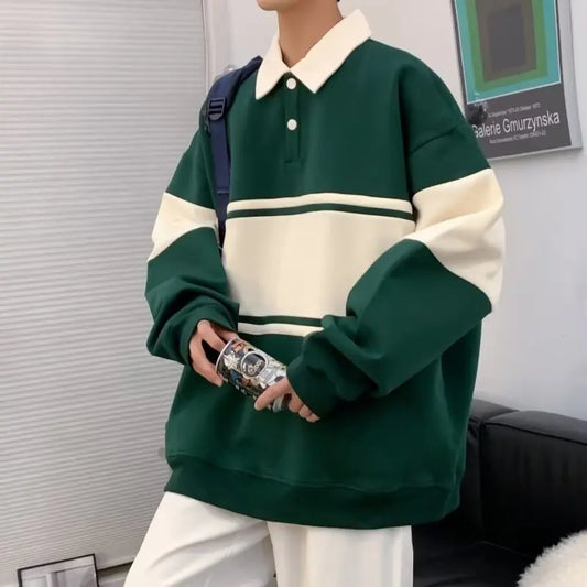 Contrast Color Sweatshirts Men All-match Loose Striped Fashion Turn-down Collar Comfortable Warm Daily Streetwear Chic Leisure