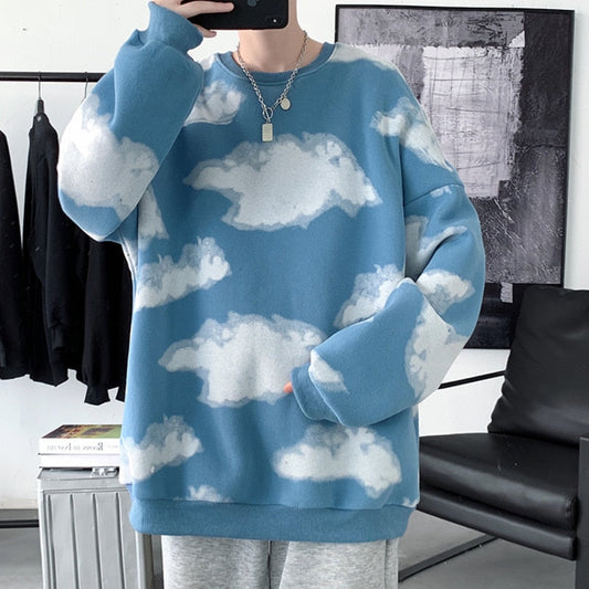 Cloud Graphic Men Oversized Sweatshirts Autumn Korean Round Neck Pullovers Streetwear Casual Unisex Tops