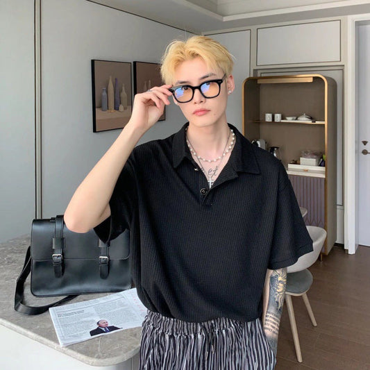 Design waffle texture cool lapel polo shirt men's light mature solid color short-sleeved T-shirt men's summer ins trend