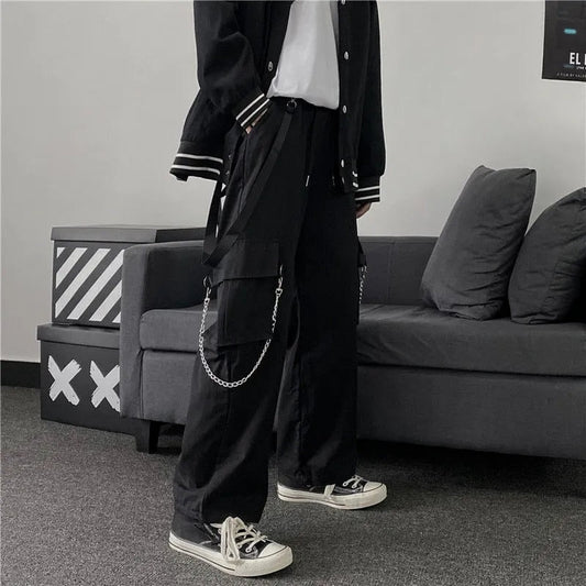 Goth Punk Black Cargo Pants With Chain Streetwear Men Wide Leg Trousers Harajuku Hip Hop Hombre Casual Joggers Pantalon Homme