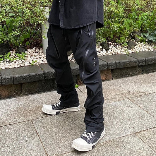 Front Double Zipper Straight Loose Vibe Style Mens Casual Trousers Drawstring Black Multi-pockets Oversized Couple Track Pants