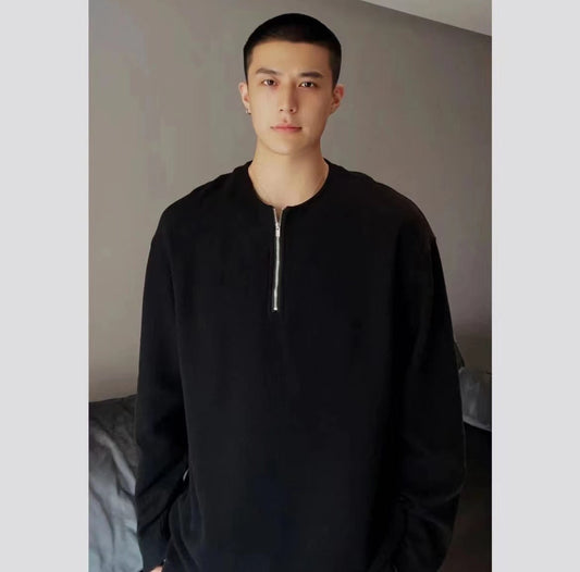 Half-zipper waffle solid color long-sleeved men's atmosphere top autumn new ins lazy style casual couple style