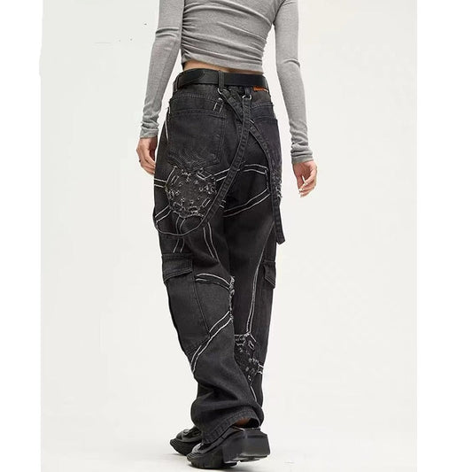 Harajuku retro tooling function black loose jeans men's 2K street clothing goth punk oversized straight pants women's wide legs
