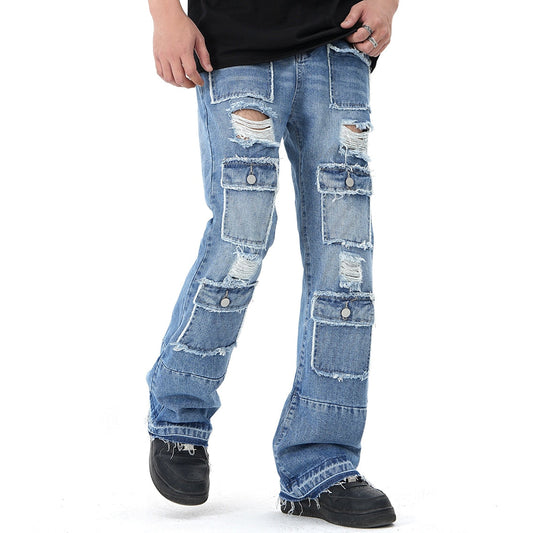 Harajuku Multi-pockets Hole Ripped Baggy Jeans for Men Y2K Straight Distressed Casual Streetwear Cargos Unisex Denim Trousers