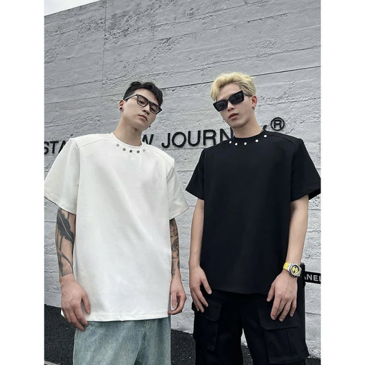 Heavy High-end Niche Short Sleeve T Shirts for Men Summer Loose Ins Design Solid Color Rivet Round Neck T-shirt Streetwear