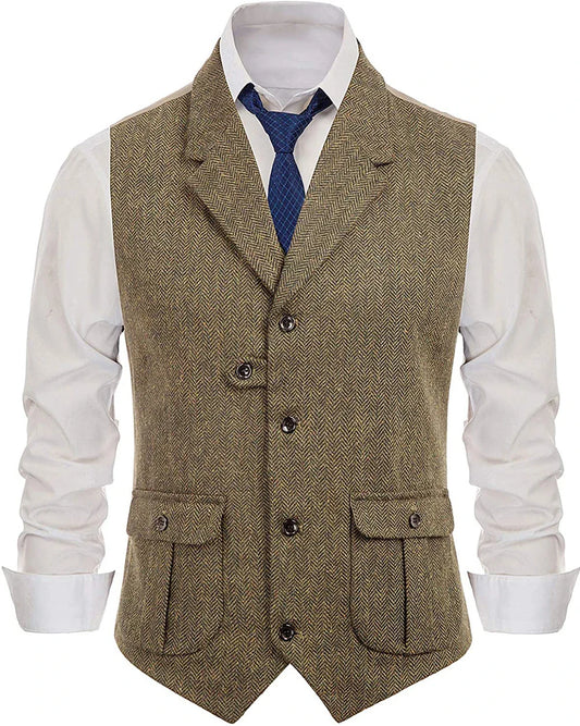 Herringbone Men's Vests Casual Suit Vest Notch Lapel with Two Pockets Herringbone Waistcoat for Wedding Groomsmen Men Vest