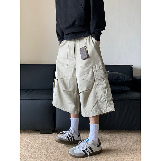 American retro big pocket wide leg workwear cropped jeans men's summer new loose versatile casual shorts