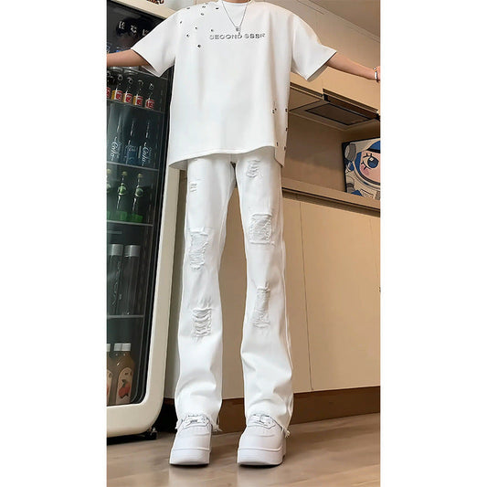 American high street cleanfit ripped jeans men's summer new straight flared pants casual all-match long pants