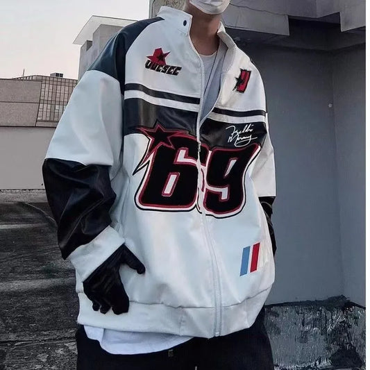 Hip Hop American PU Leather Jacket Men Patchwork Letter Embroidery Motorcycle Biker Coats Unisex Bomber Jacket Flocking Clothes