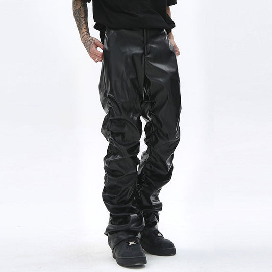 Hip Hop Mens Pleated Pu Leather Pants Harajuku Retro Streetwear Loose Ruched Casual Trousers Straight Solid Color Black Pants