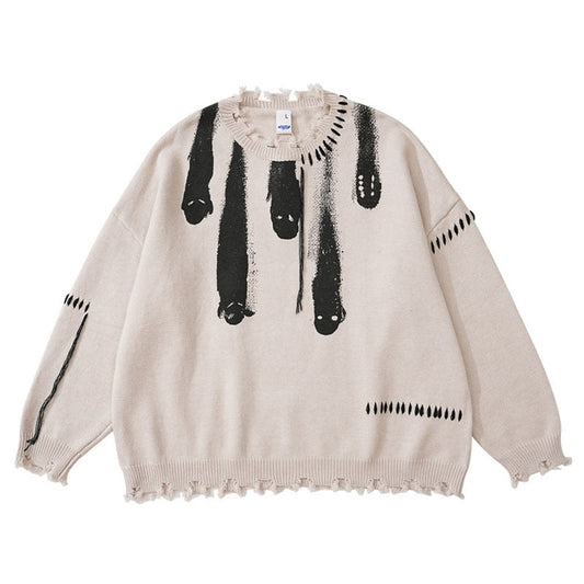 Hip Hop Knitted Sweaters Men Harajuku Vintage Hole Ghost Graphic Jumpers Streetwear Punk Casual Oversized O-Neck Pullover Unisex