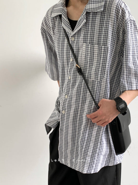 Japanese Cuban collar small plaid shirt for boys spring and summer new style college style short-sleeved small fresh shirt trend