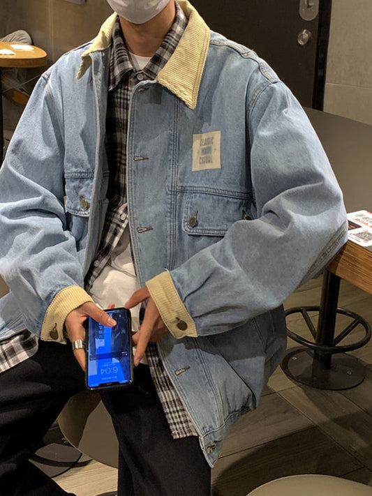 Japan Retro Lapel Denim Jacket Cityboys Punk Loose Jacket Autumn Hong Kong Style Hip Hop Handsome Stitching Jeans Coat