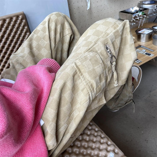 Japanese Men's Chessboard Checker Jeans Fashion Street Hip Hop Loose Straight Wide Leg Pants Couple Outerwear Pants Red Black