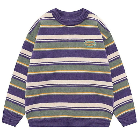 Japanese Patchwork Striped Sweater Men Knitwears New Winter Retro Vintage Harajuku Pullover Knit Embroidery Knitted Sweater