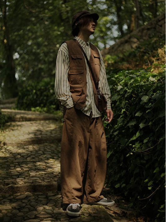 Japanese Vintage Set Men Women Multi-pocket Cargo Vest Spring Autumn Striped Long-sleeved Shirt Loose Casual Pants Three-piece