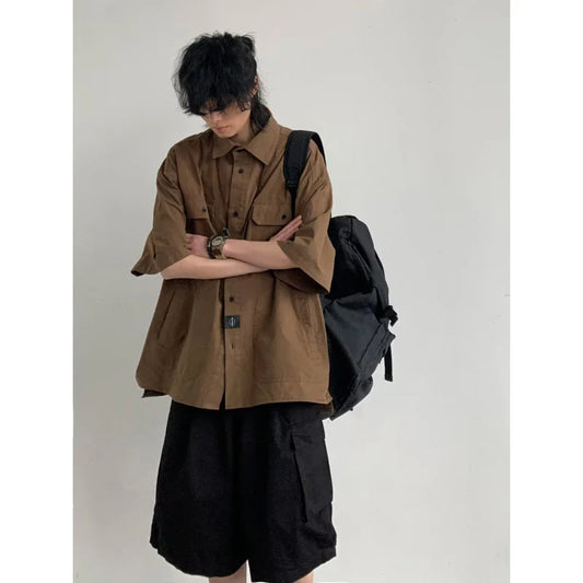 Japanese Summer Men Set Fashion Hooded Short Sleeved Shirt+Quick Drying Pockets Tooling Shorts 2-pcs Set Y2k Harajuku Trend Suit