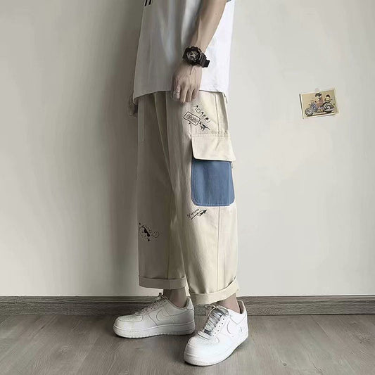 Khaki Cargo Pants with Print Baggy Loose Casual Trousers Male Summer Cotton Korean Streetweer Harajuku Cartoons Graffiti