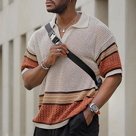 Knit Top Mens Boho Clothing Reto Polo Shirt Men Short Sleeve Vintage Sweater Contrast Hollow Summer Men Casual T Shirts Pullover