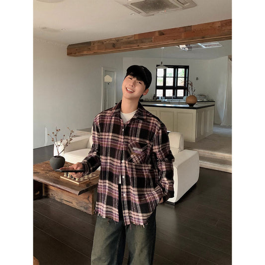 Korean Clothes Spring Plaid Shirt for Men Handsome Japanese Long Sleeve Harajuku Loose Casual Vintage Hip Hop Streetwear