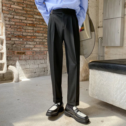 Korean Belt Suit Pants Men Fashion Solid Color Casual Dress Pants Men Loose Straight Trousers Mens Office Formal Trousers 28-34