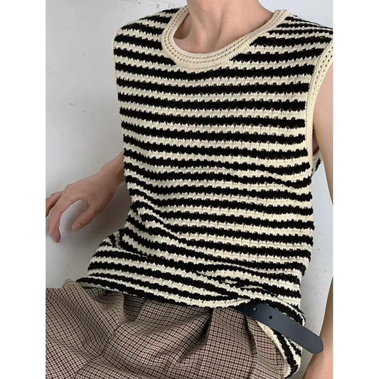 Korean Clothes Sleeveless Knitted Sweater Vest Male Striped Hollow Summer Loose Casual Harajuku Niche Design Pullover Men's Vest