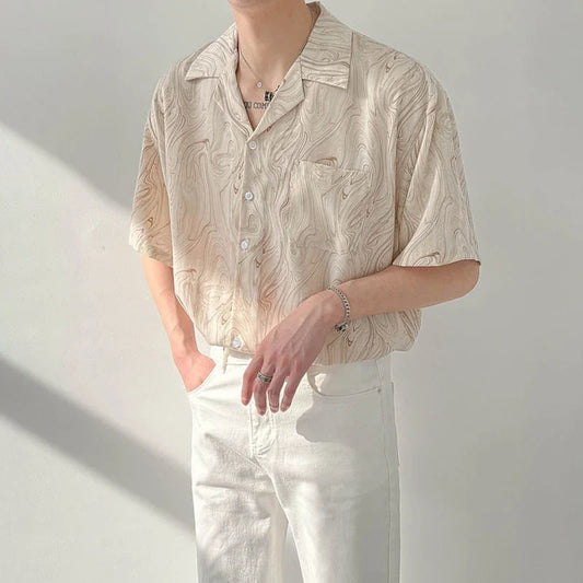 Korean Fashion Casual Geometric Shirts Handsome Pockets Button Short Sleeve Turn-down Collar Men's Clothing Thin Summer Man