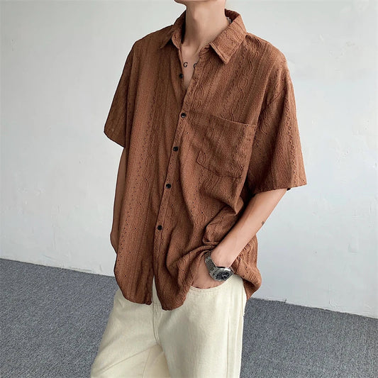 Korean Fashion Hollow Shirt for Men Summer Short Sleeve Button Trend Loose Niche Design Handsome Cotton Casual Shirts Men
