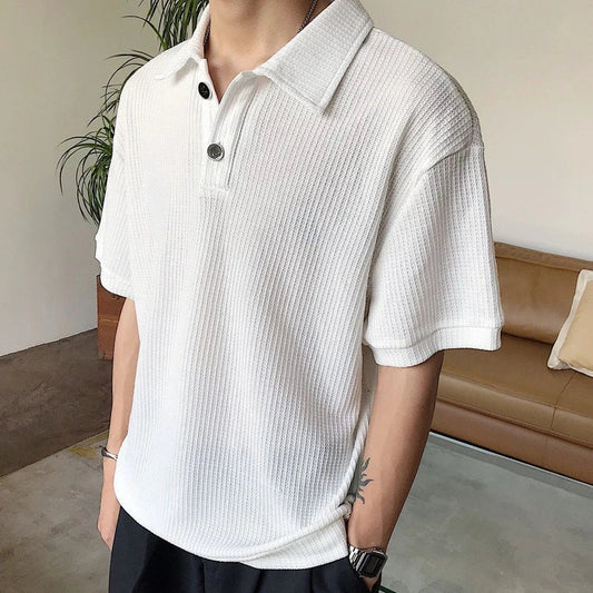 Korean Fashion Simple Short Sleeve Waffle Polo Shirt Men Advanced Texture Good Quality Lapel Loose Casual Solid Color Trend Top