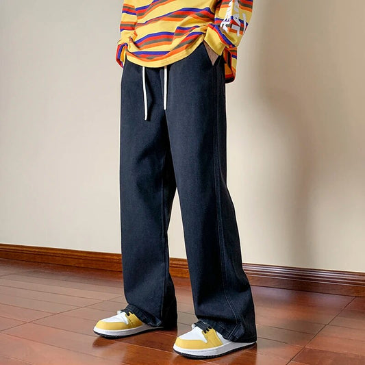 Korean Fashion Men's Black Baggy Jeans Drawstring Design Elastic Waist Streetwear Jeans Loose Straight Denim Skate Pants Male