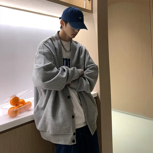 Korean Fashion Ins Cardigan Button Sweatshirts for Men Autumn Japanese Casual Loose V-neck Harajuku Couple Sweatshirt Jacket