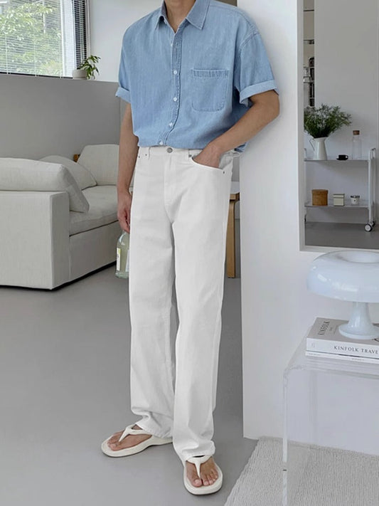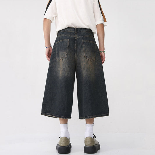 Korean Style Vintage Men's Jeans Summer Loose Male Wide Leg Knee Length Shorts New Washed Fashion Denim Trouser