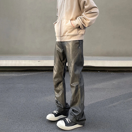 Leather Pants Men Streetwear Casual New Fashion Baggy Straight Leg Stacked Street Patchwork Original Y2k Flared Vintage Trousers