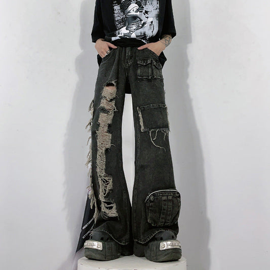 American retro wasteland style ripped multi-pocket bell bottom pants men's summer slim design workwear long pants trendy