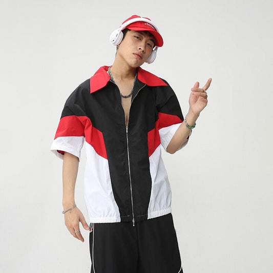 Male Shoulder Pad Shirts Stylish Contrast Color Splice Zipper Tops Men's Casual Short Seleeves Cardigans New
