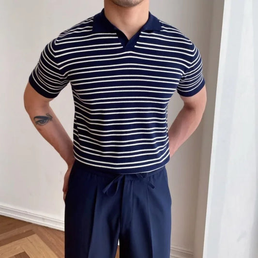 Mature Men Clothing Summer New V-neck Striped Polo Shirt for Men Short Sleeve Trend Simple Fashion Lapel T-shirt Polo Shirts
