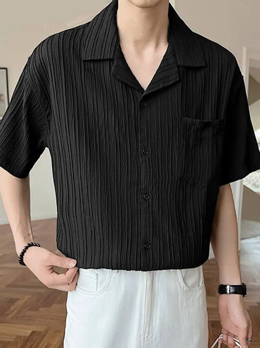 Men Shirt Folds Striped Lapel Short Sleeve Button Streetwear Korean Casual Shirts Summer Leisure Men Clothing S-5XL