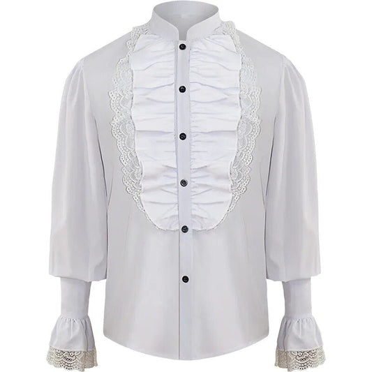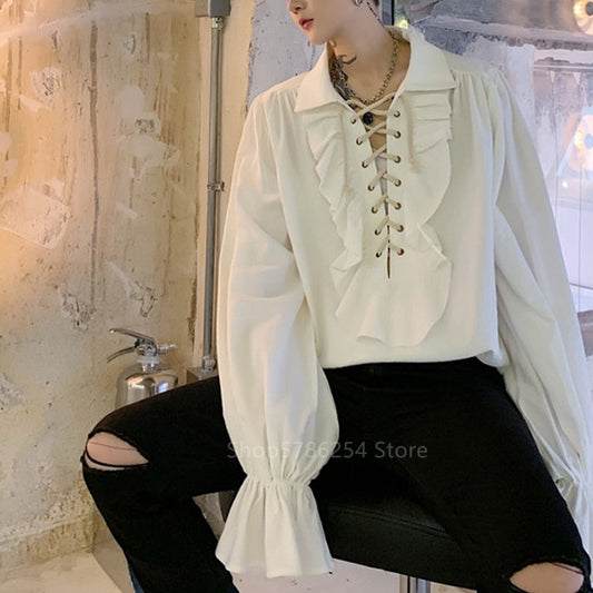 Men Ruffle Shirts Blouse Tops Lace Up Retro Gothic Flare Sleeve Victorian White