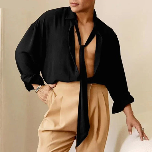 Men Shirt Lapel Long Sleeve Lace Up Streetwear Button Loose Casual Men Clothing Solid Color Fashion Camisas S-5XL