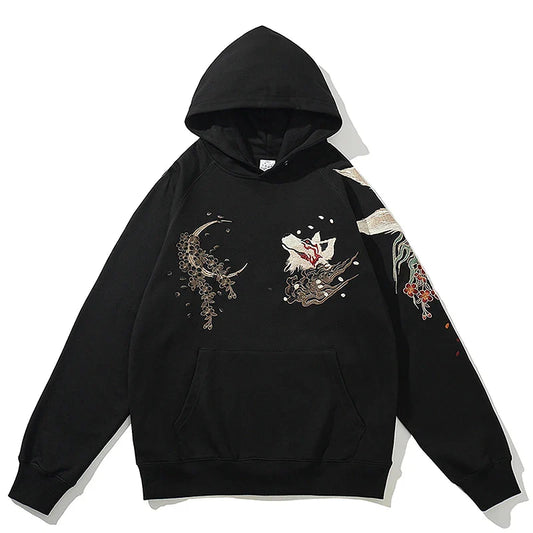 Men Streetwear Fleece Hoodie Sweatshirt Embroidery Flower Chinese Kanji Pullover Winter Harajuku Cotton Hooded Hoodie