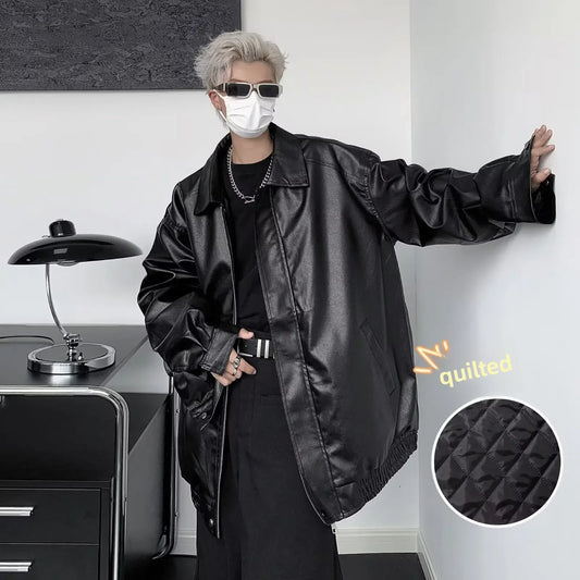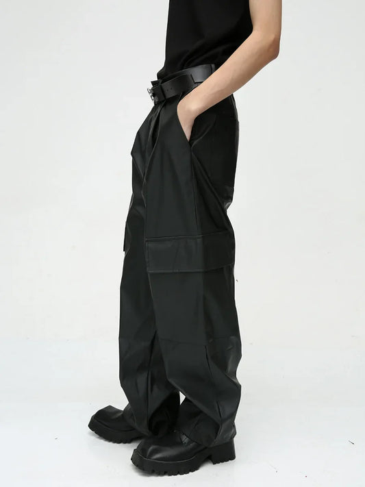 saferido Autumn American style pleated design drape floor mopping niche casual PU leather pants men's trendy pants pantalon homme cuir