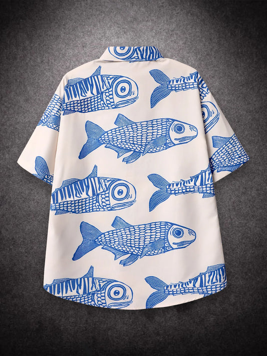 saferido Oversized Loose Men Shirt American Style Summer Fried Street Fashion Small Fish Print New Personalized Mens Casual Shirts