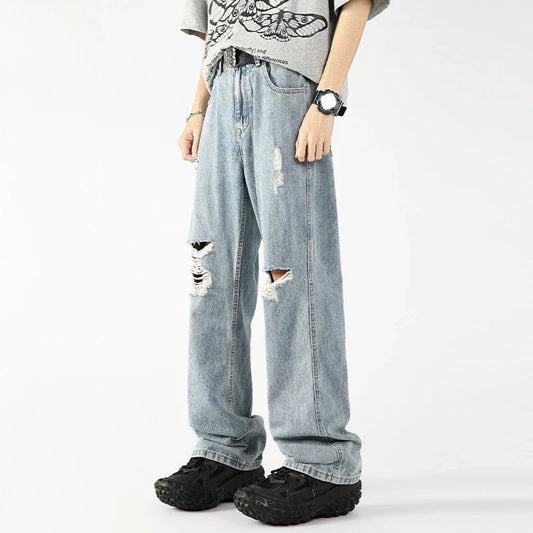 saferido Men's Wear Spring Autumn Thin Light Ice Silk Ripped Jeans American Style Street Tough Straight-leg Trousers