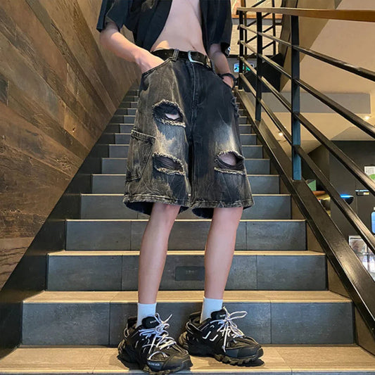 saferido Mens Denim Shorts Ripped Trendy Y2k Lightning Pattern Shorts High Street American Style Versatile Retro Shorts Thin Summer