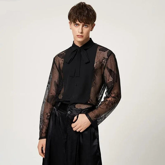 Tops American Style New Men Fashion Solid Ribbon Blouse Male Stitching Butterfly Lace Long Sleeve Thin Shirts S-5XL