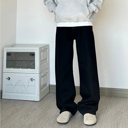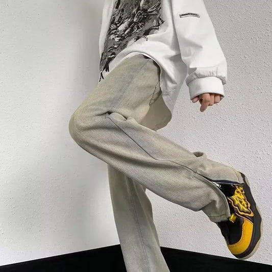 saferido Trendy Black American Style Vibe Straight-leg Jeans Men's Casual Loose Fit Zippered Side Slit Denim Trousers